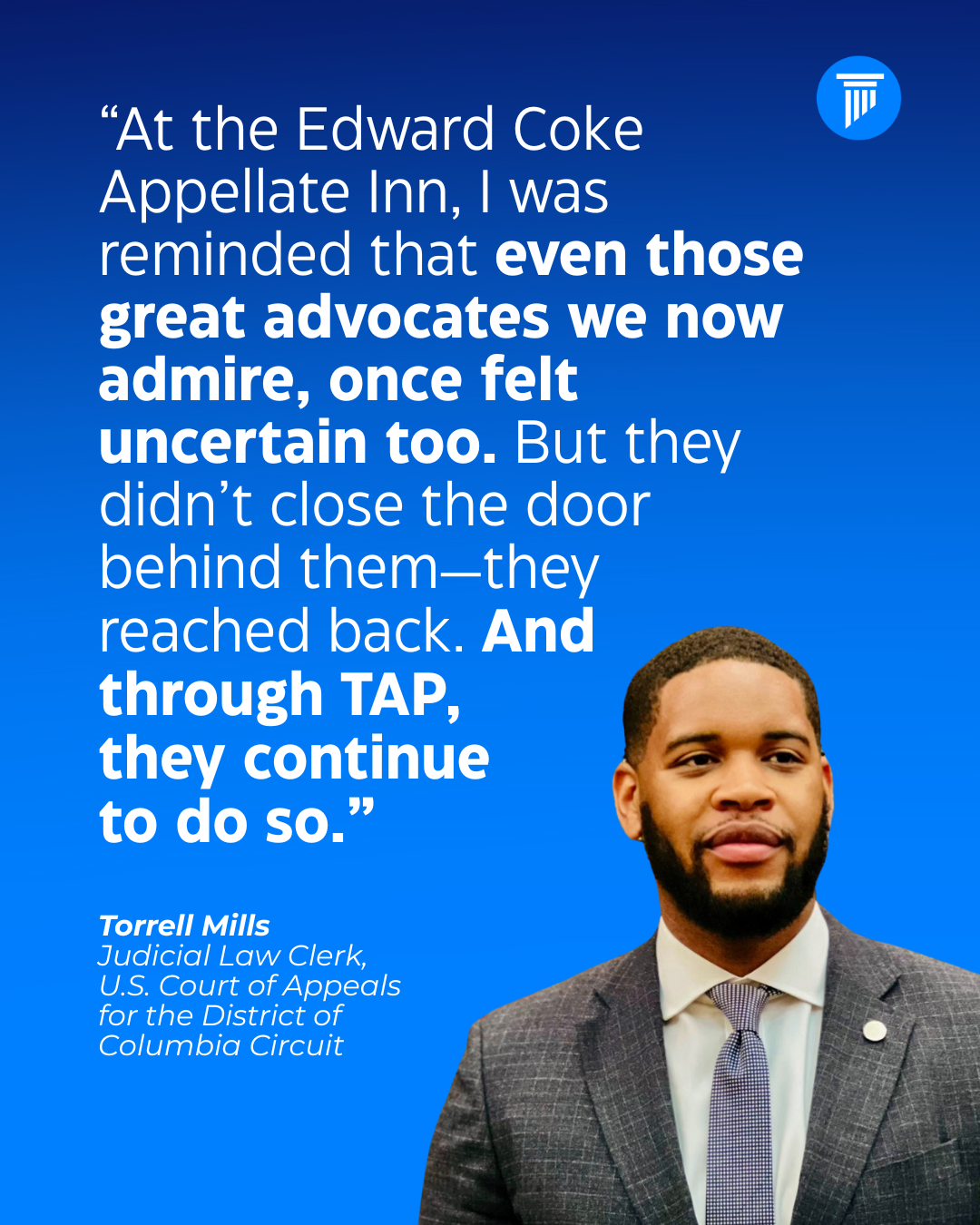 Last month, TAP alumni had the rare opportunity to attend a private event hosted by the Edward Coke Appellate Inn of Court—the first and only American Inn of Court dedicated specifically to appellate practice. Based in Washington, D.C., the Inn is composed of some of the most respected appellate advocates and judges in the country. Events like this one are designed to give future leaders in appellate law a window into not just what this field requires, but how it’s practiced at the highest levels.