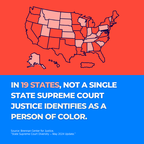 In 19 states, not a single state supreme court justice identifies as a person of color—including 13 states where people of color comprise at least 20% of the population. (Source: Brennan Center for Justice, “State Supreme Court Diversity—May 2024 Update.”)